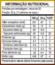 Ingredientes: açúcar, cacau em pó lecitinado e aromatizante.